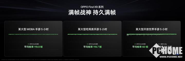 在主流 MOBA 手游中,Find X9系列轻松实现了最高帧率连续 5 小时满帧运行,稳定无波动;即使是在第三方进行的大型开放世界手游测试中,Find X9系列仍可实现最高帧率 5 小时全满帧运行,在复杂场景渲染、高频技能释放等场景下帧率始终稳定,为用户带来真正的“满帧自由”。与之相比,其他最新发布的旗舰手机,全程帧率表现波动更大,且未达到4小时便电量耗尽关机。