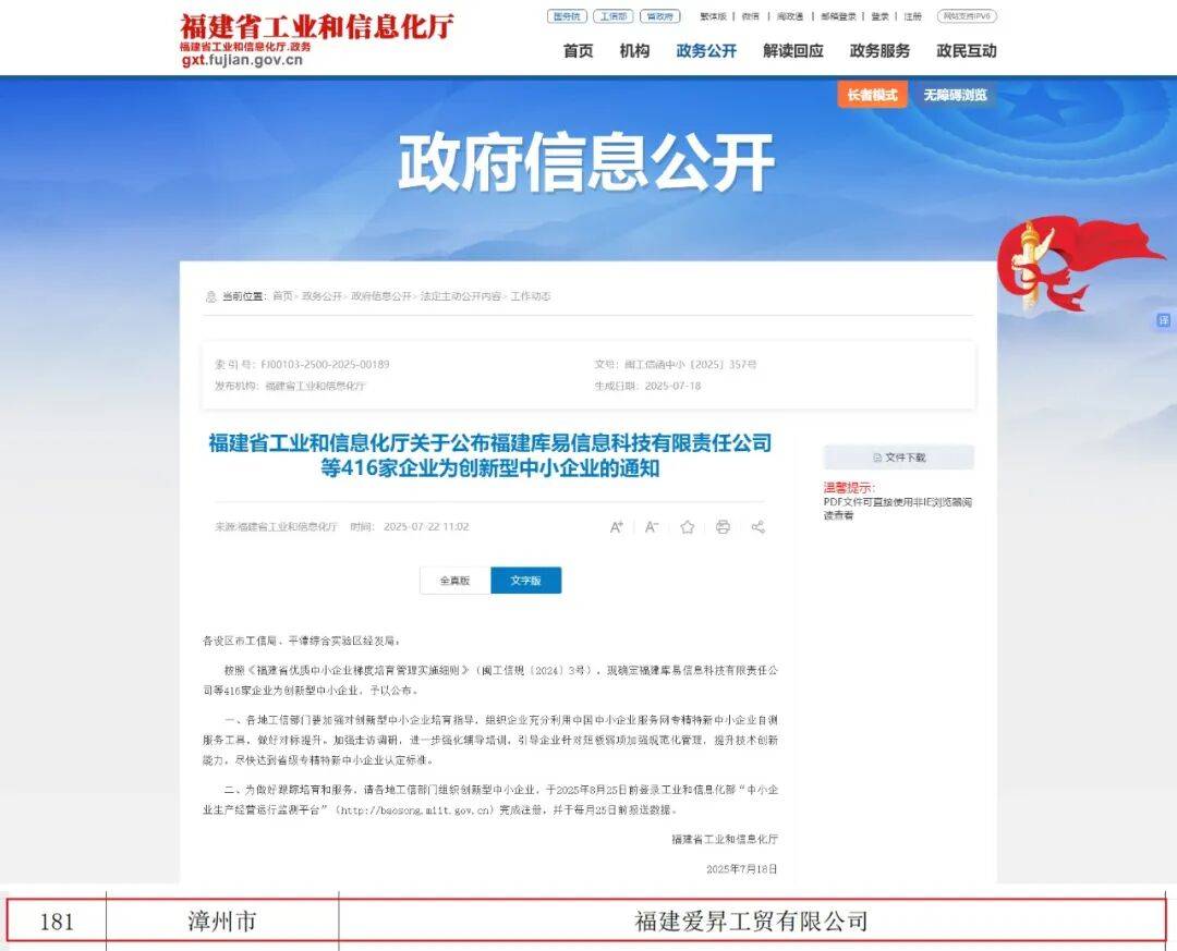 值此国庆中秋佳节来临之际,爱昇工贸喜传捷报:凭借卓越的创新能力、敏锐的市场洞察力以及诚信可靠的服务,公司成功荣获2025年“福建省创新型中小企业”荣誉称号!这标志着爱昇工贸在科技创新能力、成果转化效率及产业贡献度等方面获得政府相关部门的高度认可,充分展现了企业稳健的发展态势、强劲的产业韧性以及积极履行社会责任的企业担当。
